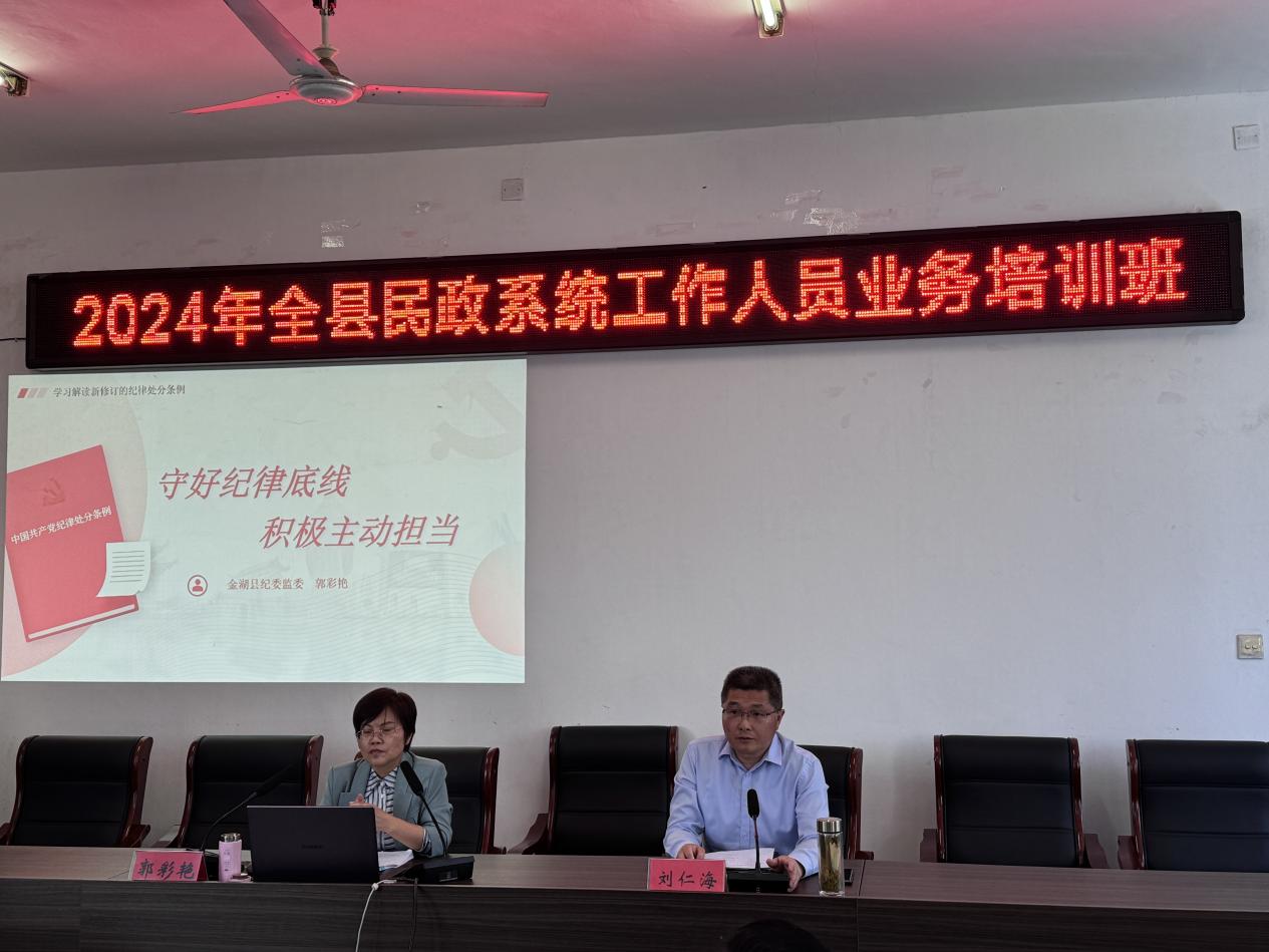 5月31日上午,县纪委副书记郭彩艳作题为《守好纪律底线 积极主动担当》的纪法宣讲,从“认识新《条例》”、“如何构筑遵规守纪的坚固堤坝”等方面,结合具体案例,对新修订的《中国共产党纪律处分条例》进行了详细解读。县社科联主席衡云红衡云红同志,结合大量具体案例,为全体民政工作人员上了一堂精彩生动的专题辅导课,让参训人员对“意识形态工作是党的一项极端重要的工作”有了更加深刻的理解和把握。