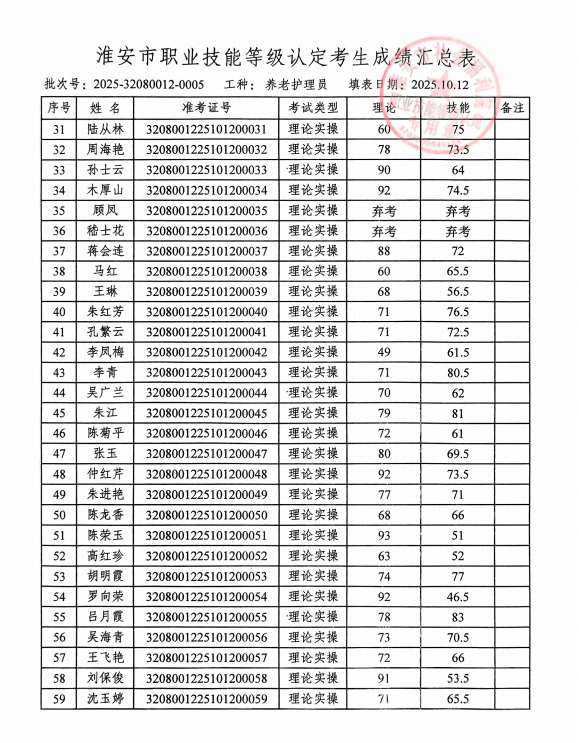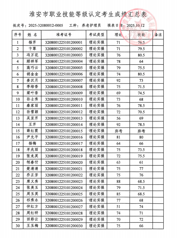 淮安市社会福利院职业技能等级鉴定中心评价的批次号:2025-32080012-00005养老护理员四级成绩予以公示,若对公示结果有异议的,请于10月17日前到我院等级认定中心进行查询。电话:83766137