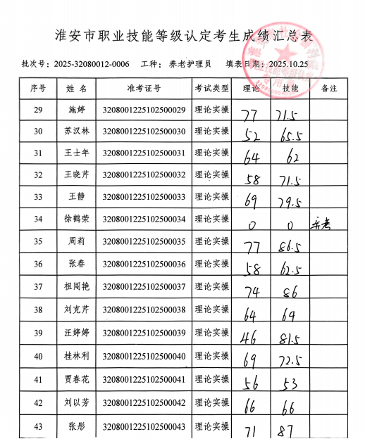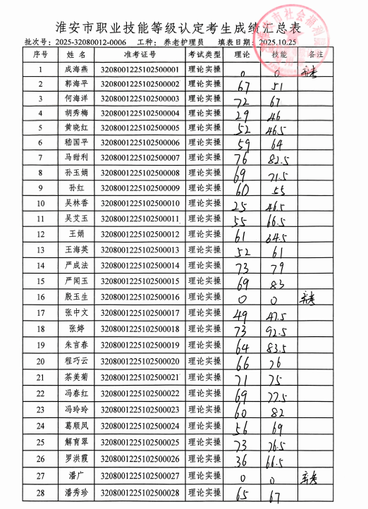 淮安市社会福利院职业技能等级鉴定中心评价的批次号:2025-32080012-00006养老护理员四级成绩予以公示,若对公示结果有异议的,请于11月3日前到我院等级认定中心进行查询。电话:83766137