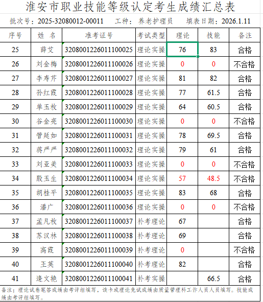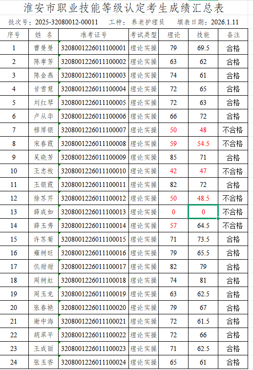 淮安市社会福利院职业技能等级鉴定中心评价的批次号:2025-32080012-00011养老护理员四级成绩予以公示,若对公示结果有异议的,请于1月16日前到我院等级认定中心进行查询。电话:83766137