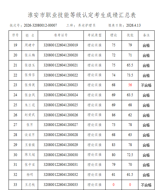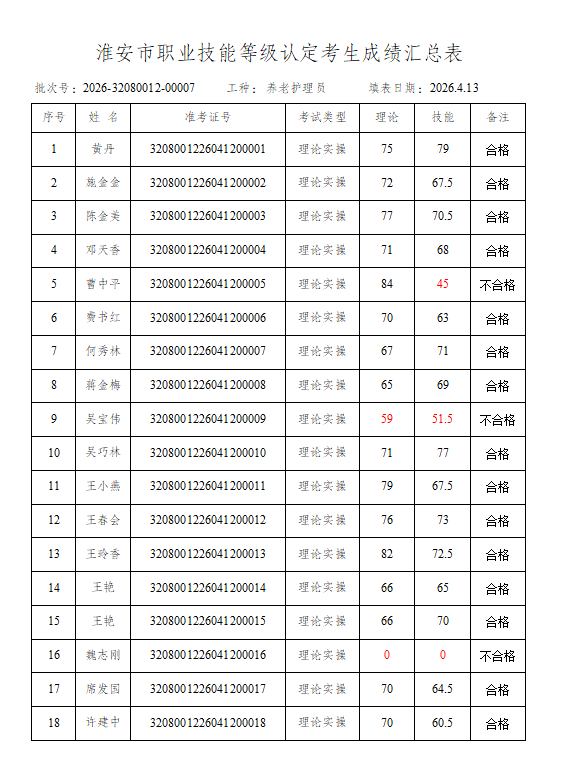 淮安市社会福利院职业技能等级鉴定中心评价的批次号:2026-32080012-00007养老护理员四级成绩予以公示,若对公示结果有异议的,请于4月17日前到我院等级认定中心进行查询。电话:83766137