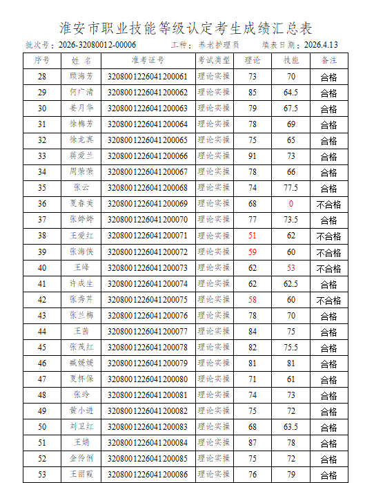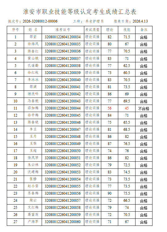 淮安市社会福利院职业技能等级鉴定中心评价的批次号:2026-32080012-00006养老护理员四级成绩予以公示,若对公示结果有异议的,请于4月17日前到我院等级认定中心进行查询。电话:83766137