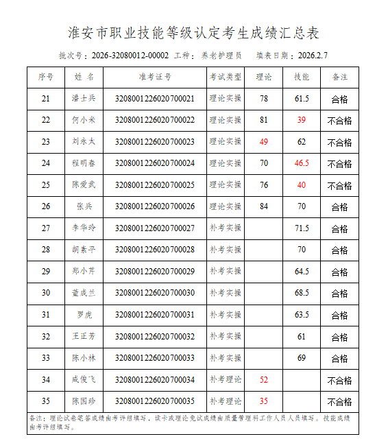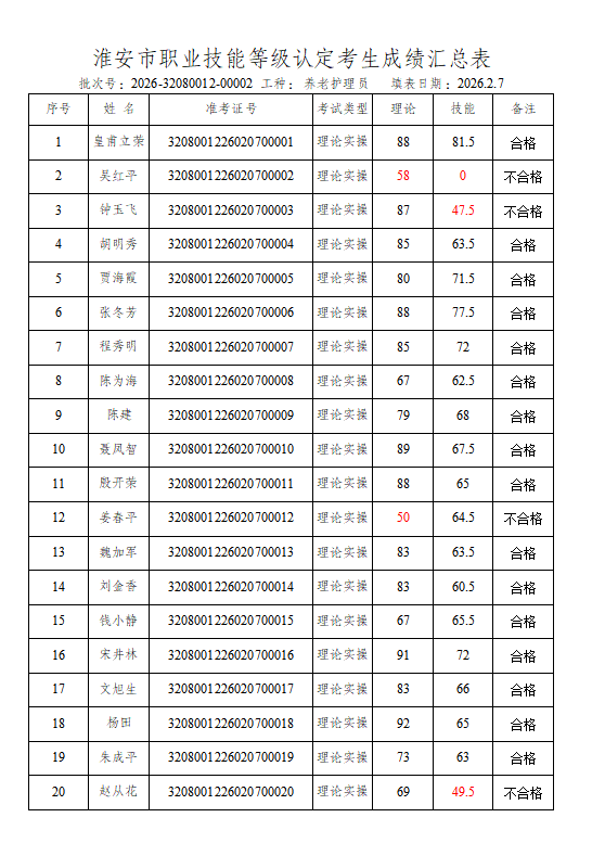 淮安市社会福利院职业技能等级鉴定中心评价的批次号:2026-32080012-00002养老护理员四级成绩予以公示,若对公示结果有异议的,请于2月14日前到我院等级认定中心进行查询。电话:83766137